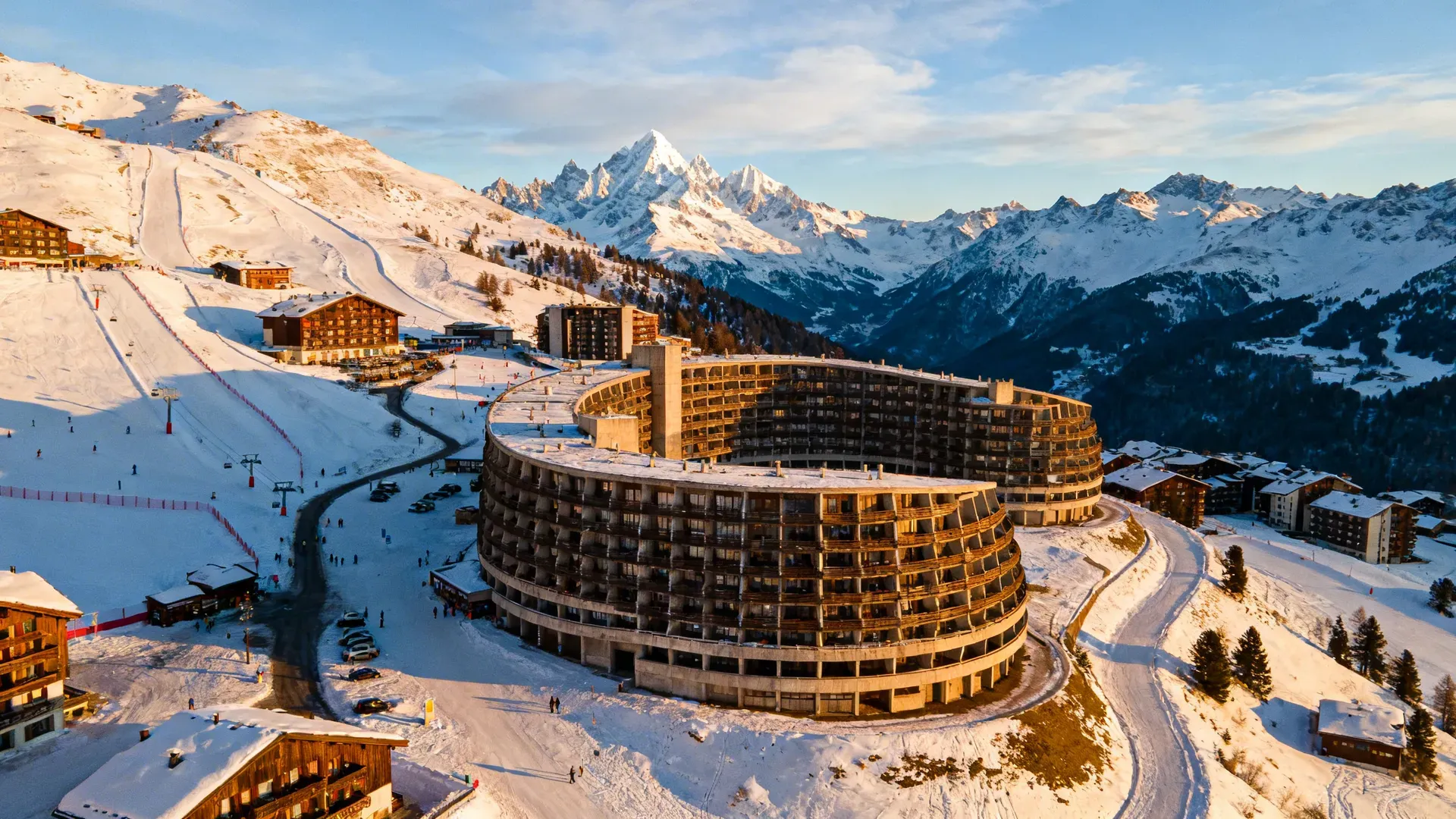 Les Arcs 1800 vormt het hart van het Les Arcs skigebied, gelegen op een zonnig plateau met spectaculair uitzicht op de Mont Blanc. Via de Vanoise Express kabelbaan bereik je het aangrenzende La Plagne, waardoor het gigantische Paradiski gebied toegankelijk wordt. Met 153 pistes en moderne liften is er voor ieder wat wils, van groene beginnerhellingen tot uitdagende zwarte afdalingen. Het gebied staat bekend om zijn uitstekende snowparks en mogelijkheden voor off-piste skiën. De après-ski Les Arcs 1800 scene is levendig met diverse bars en restaurants.